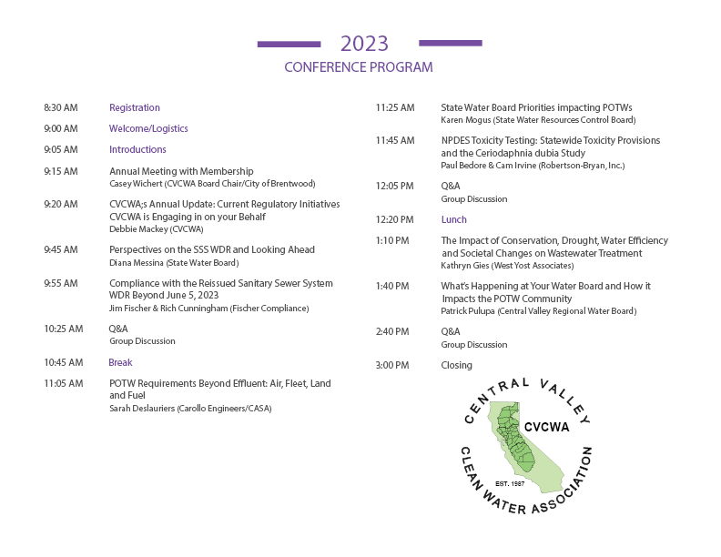 The 2023 CVCWA Annual Conference will be held from 9am – 3:00pm on Thursday, May 11, 2023 at the Sacramento Regional County Sanitation District on 10060 Goethe Road, Sacramento, CA 95827. Lunch will be provided.